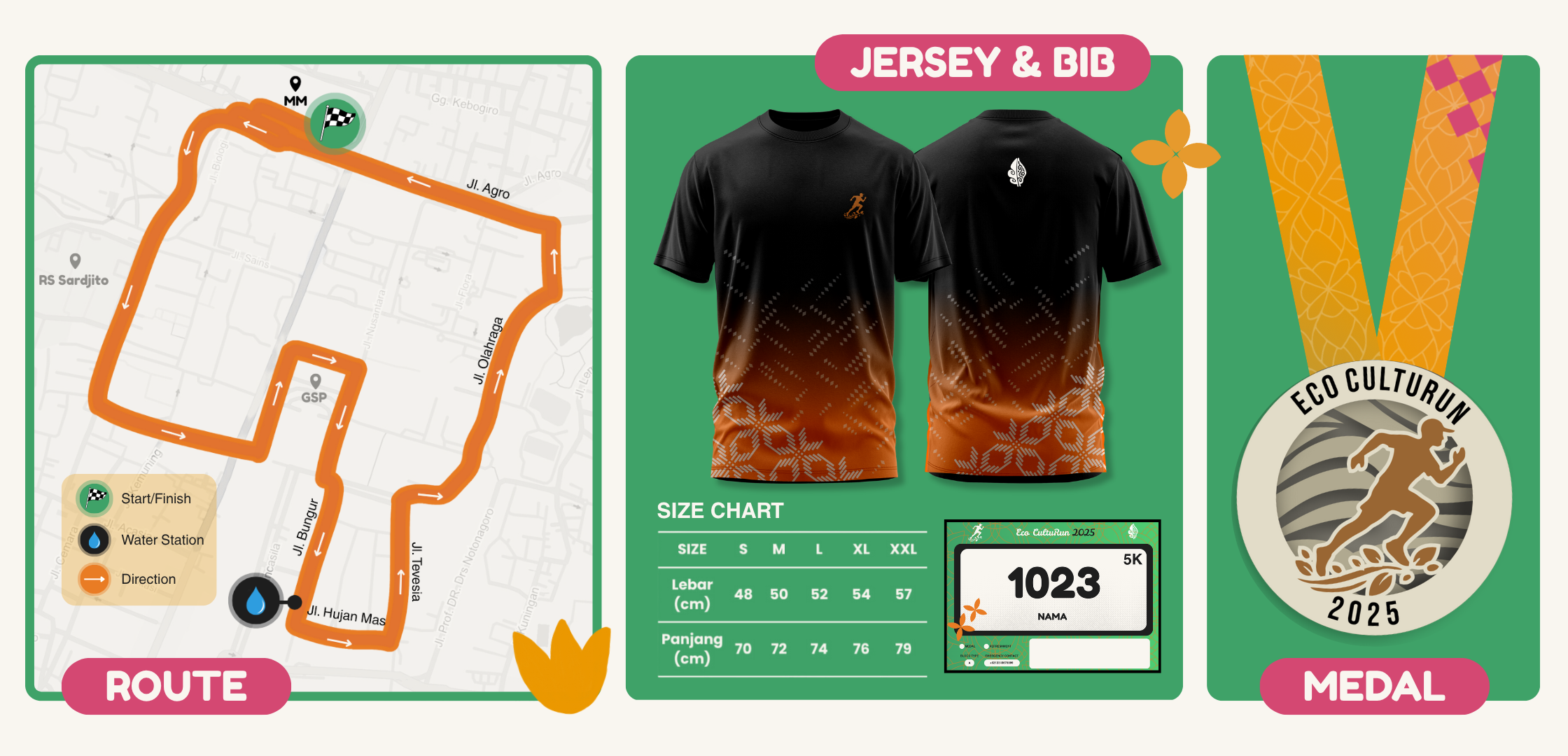 Fasilitas: Jersey eksklusif, medali ramah lingkungan, race pack, BIB number, produk sponsor, refreshment, atmosphere Eco Culture Festival.